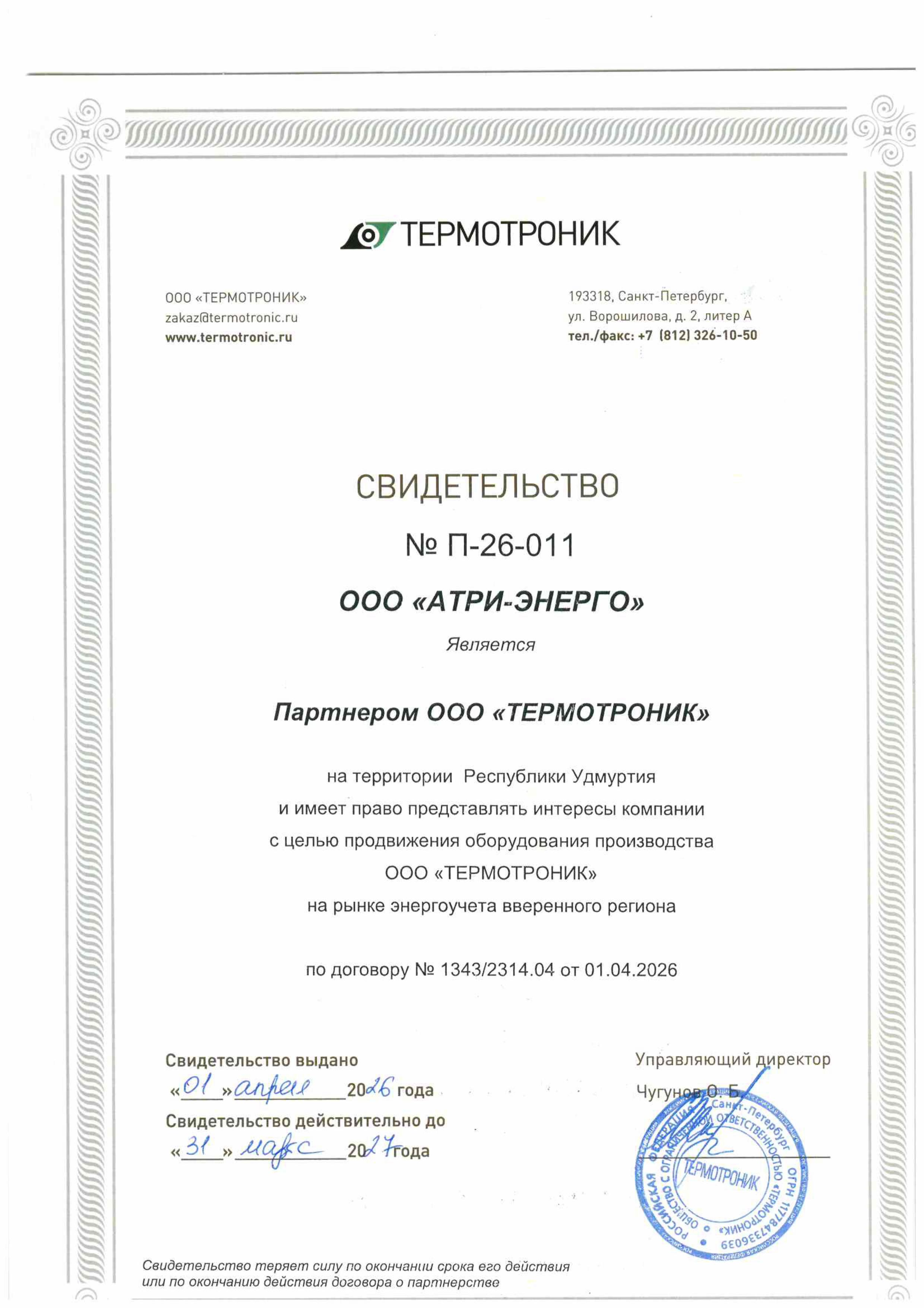 Свидетельство подтверждает, что ООО «АТРИ-ЭНЕРГО» является партнёром ООО «Термотроник» на территории Республики Удмуртия и имеет право представлять интересы компании с целью продвижения оборудования производства ООО «Термотроник» на рынке энергоучета вверенного региона по договору № 1343/2314.04 от 1.04.2026