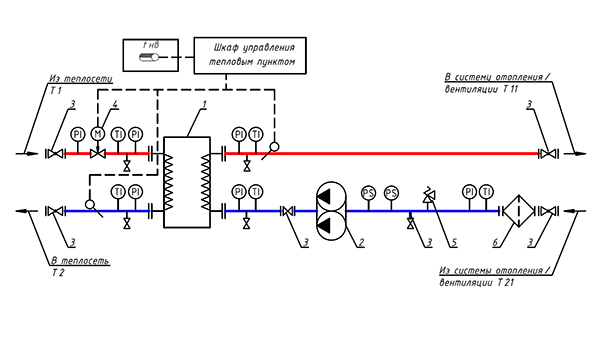 Блок Отопления/Вентиляции предназначен для подключения объекта к тепловым сетям, преобразования тепловой энергии, поддержания требуемых параметров теплоносителя во внутренней системе отопления или вентиляции.