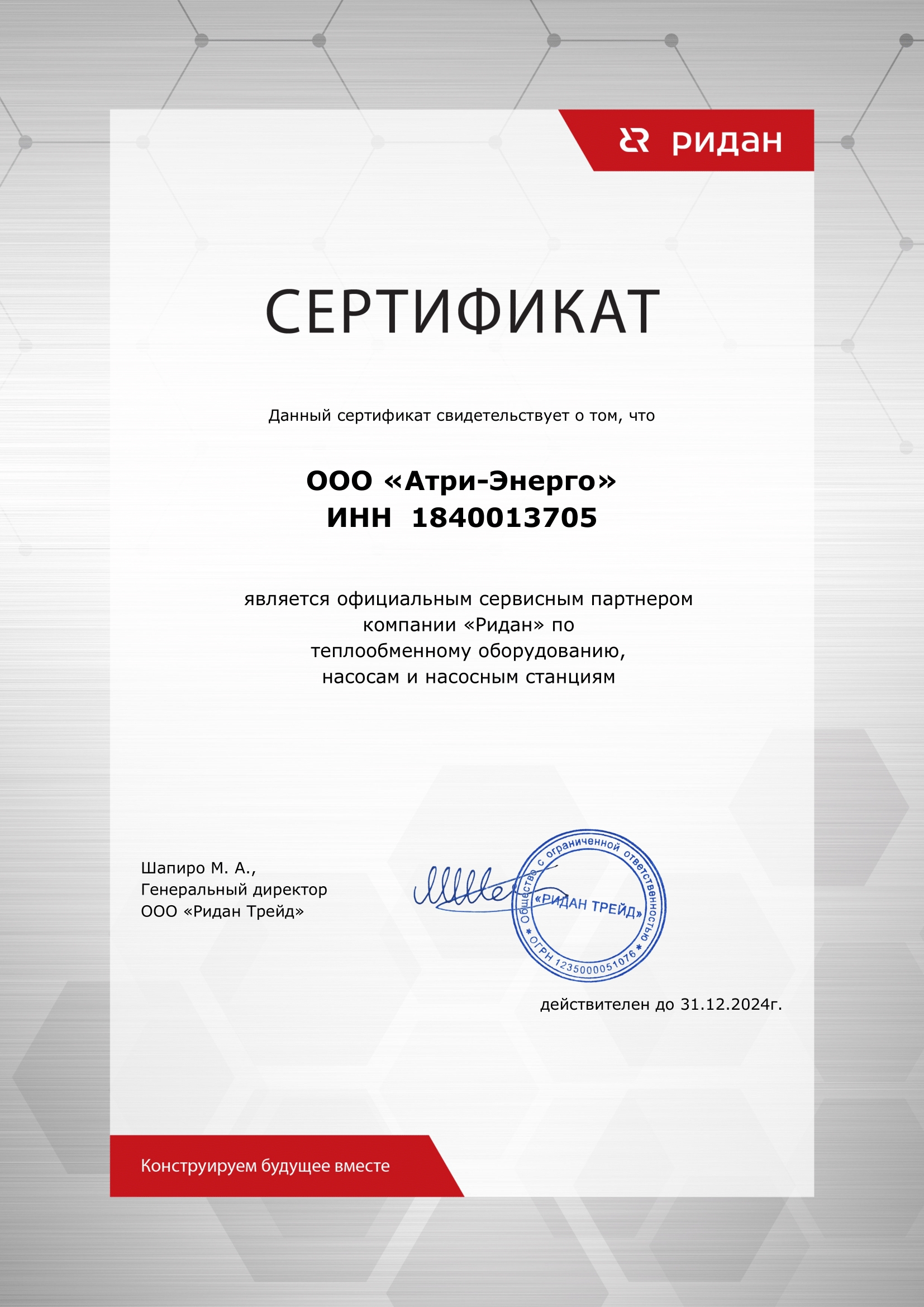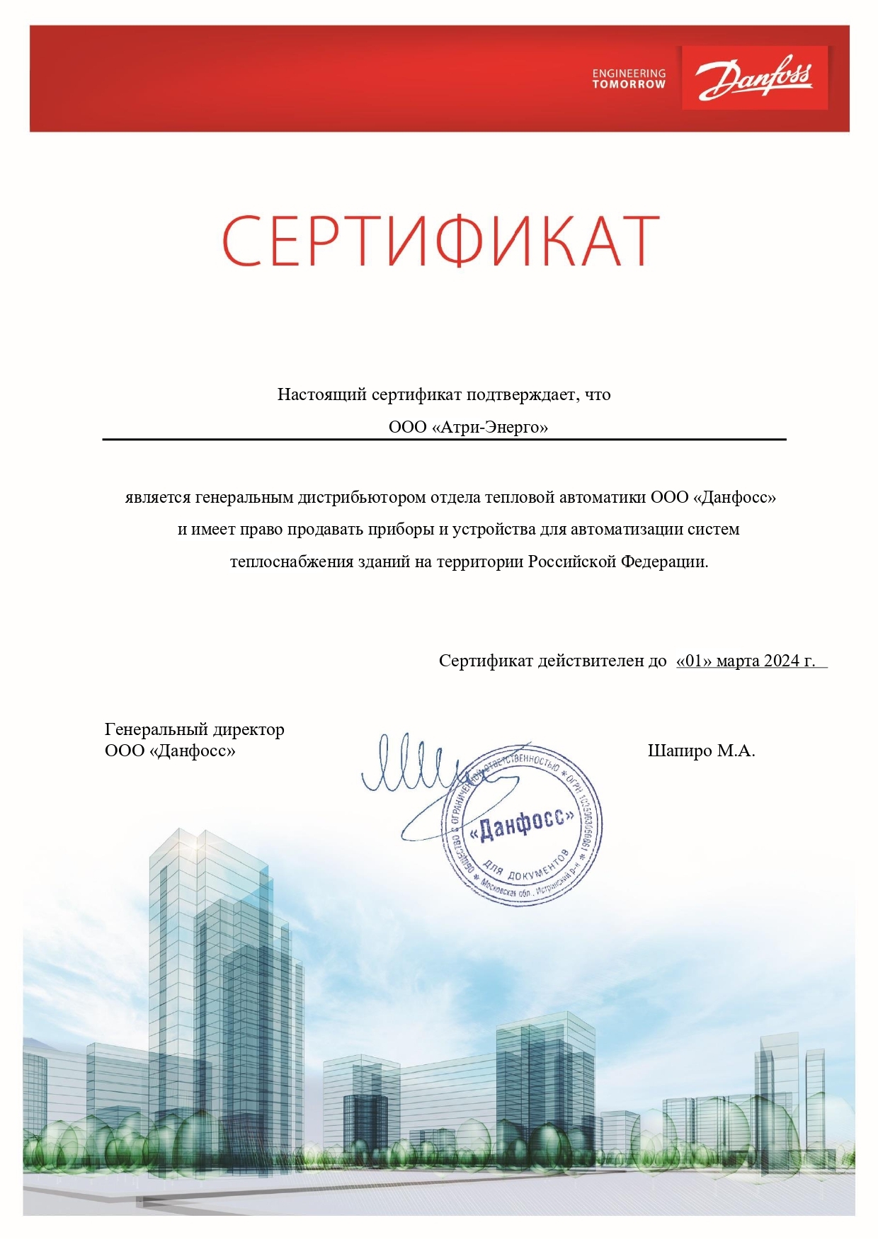 Сертификат подтверждает, что ООО «АТРИ-ЭНЕРГО» является генеральным дистрибьютером отдела тепловой автоматики ООО «Данфосс» и имеет право продавать приборы и устройства для автоматизации систем теплоснабжения зданий на территории Российской Федерации.