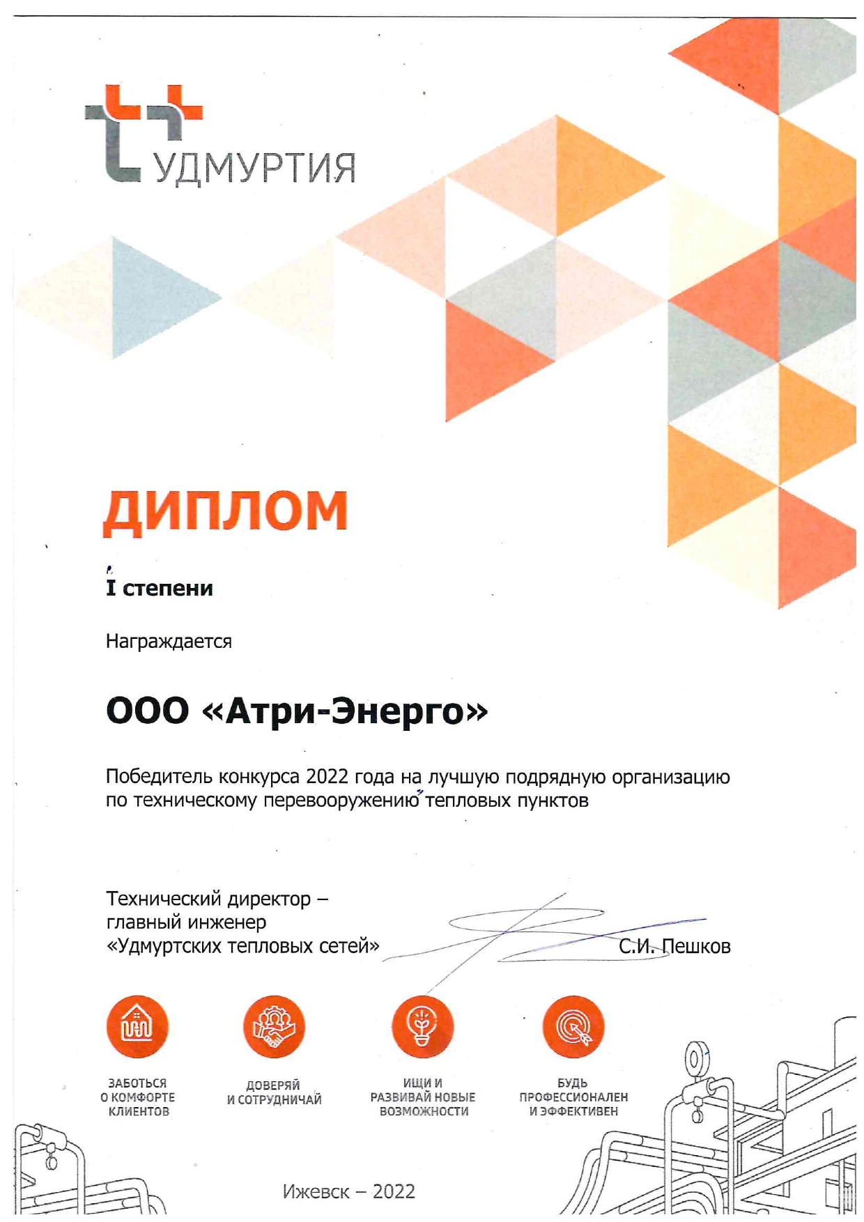 Диплом I степени. Победители конкурса 2022 года на лучшую подрядную организацию по техническому перевооружению тепловых пунктов.