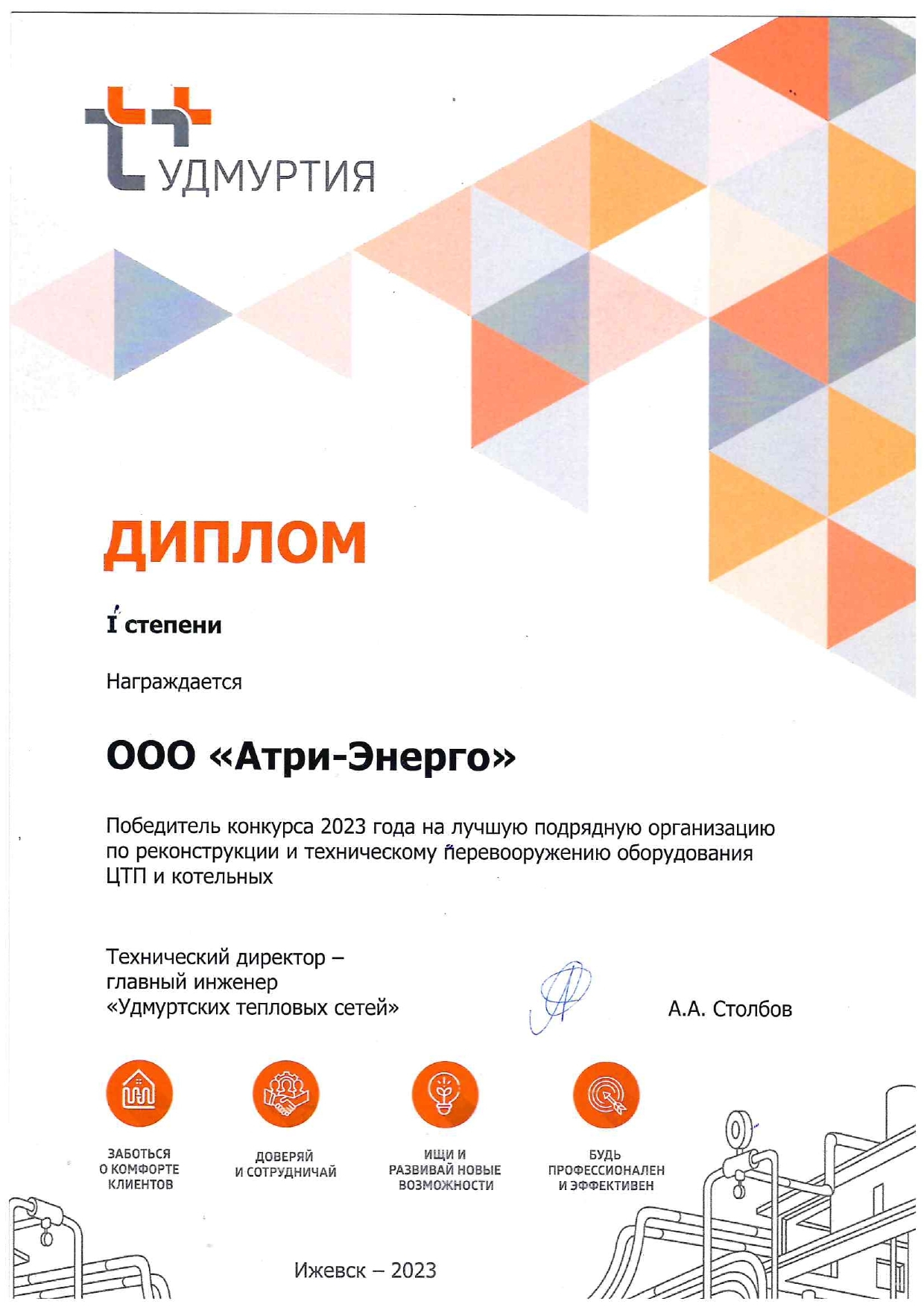 Диплом I степени. Победитель конкурса 2023 года на лучшую подрядную организацию по реконструкции и техническому перевооружению оборудования ЦТП и котельных.