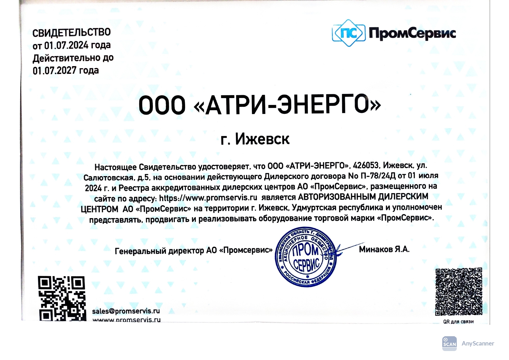 Настоящее Свидетельство удостоверяет, что ООО "Атри-Энерго", является авторизованным дилерским центром АО "ПромСервис" на территории г. Ижевска, Удмуртская республика и уполномочен представлять, продвигать и реализовывать оборудование торговой марки "ПромСервис".